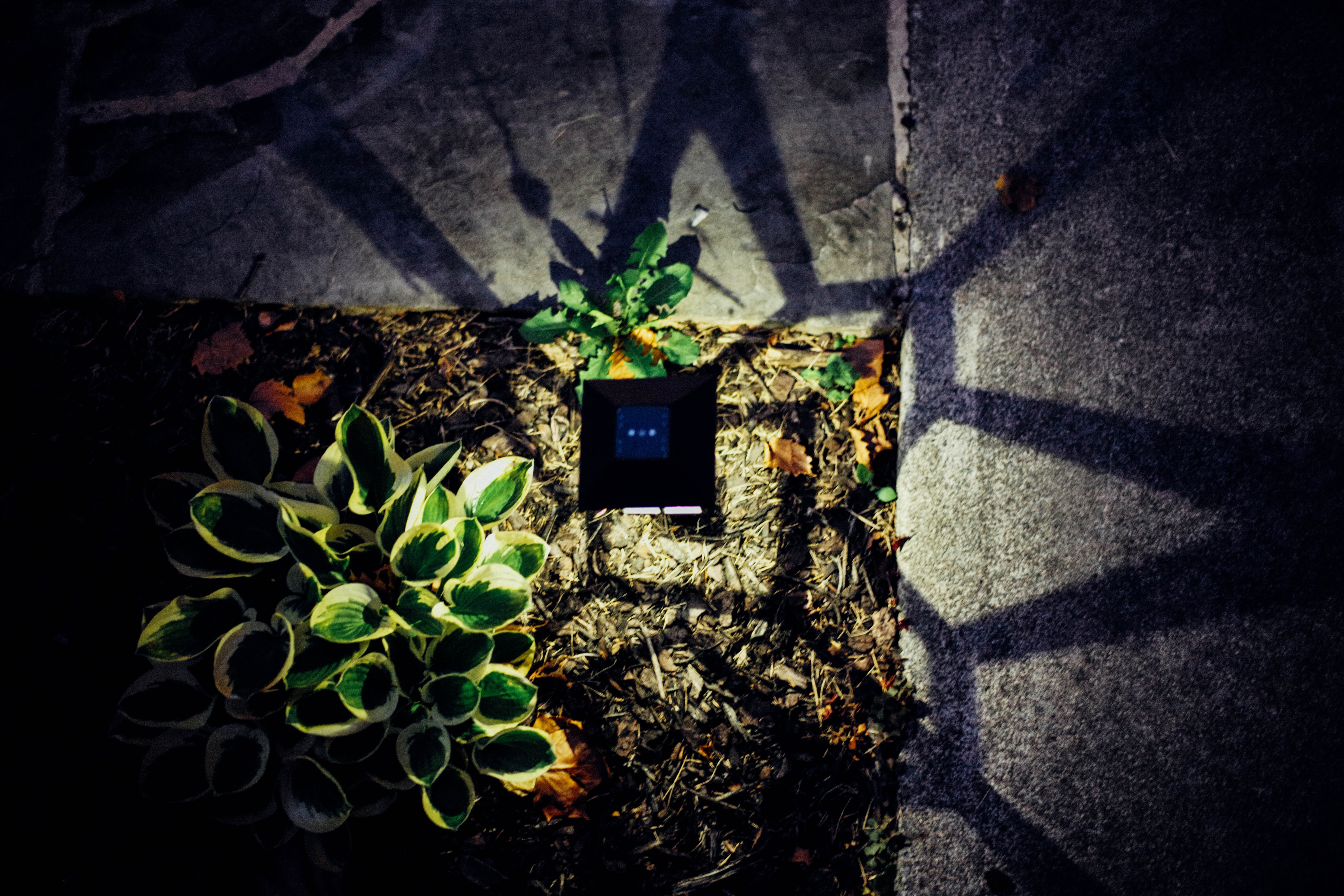In the stillness of night, a solitary black object rests among vibrant green foliage, surrounded by fallen leaves. Soft lighting casts delicate shadows that weave intricate patterns across the ground, creating a moody atmosphere. The contrast between the dark and illuminated areas evokes a sense of mystery and contemplation.