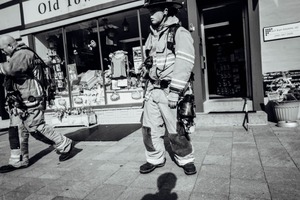 Set against a backdrop of bustling storefronts, two firefighters stride purposefully down the street, their heavy gear contrasting sharply with the vibrant scene behind them. The black-and-white composition amplifies the solemnity of their duty, capturing a moment of quiet resolve amid everyday life. The lighting casts long shadows, adding depth to their presence as guardians of safety in a lively environment.