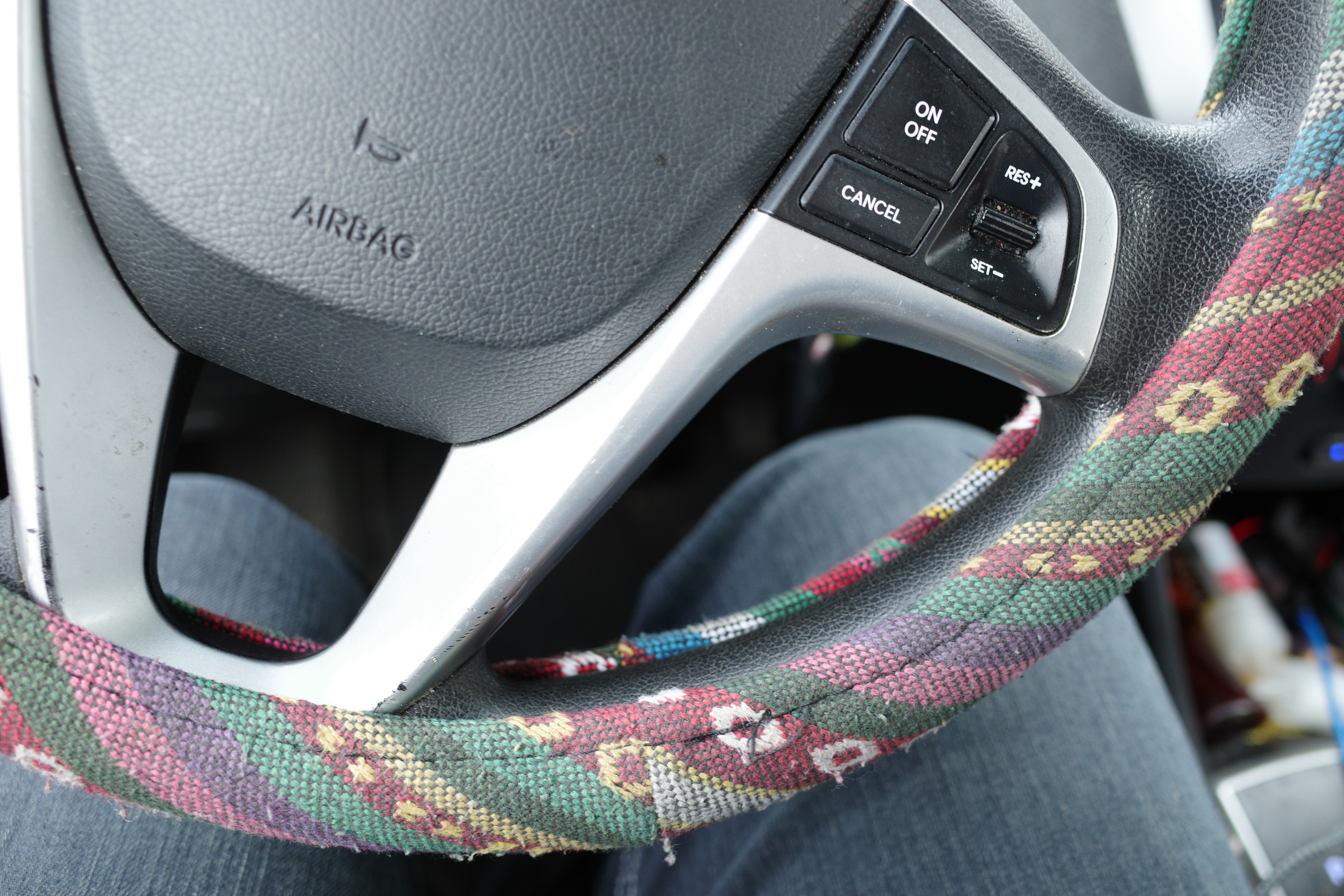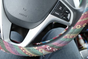 This close-up photograph captures the intricate design of a patterned steering wheel, suggesting a personal touch in the everyday act of driving. The muted lighting emphasizes the textured fabric, while the blurred background hints at the motion of a journey ahead. A sense of intimacy is evoked, inviting viewers to reflect on the personal connections formed with their vehicles.