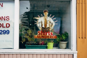 The photograph captures a nostalgic storefront window featuring a colorful sign declaring 'Shirts Laundered,' complete with a stylized image of a smiling man in a shirt and tie. Soft natural light filters through, illuminating the greenery within, which adds a touch of life to the scene. The composition balances retro elements with a contemporary vibe, evoking a sense of warmth and familiarity in an urban setting.