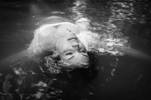 In this captivating black-and-white photograph, a woman floats serenely on the water's surface, her expression peaceful and contemplative. The gentle ripples around her create a dreamlike atmosphere, while the soft, diffused lighting enhances the tranquil mood. The composition draws the viewer in, inviting them to share in this moment of quiet reflection amidst the fluidity of the water.