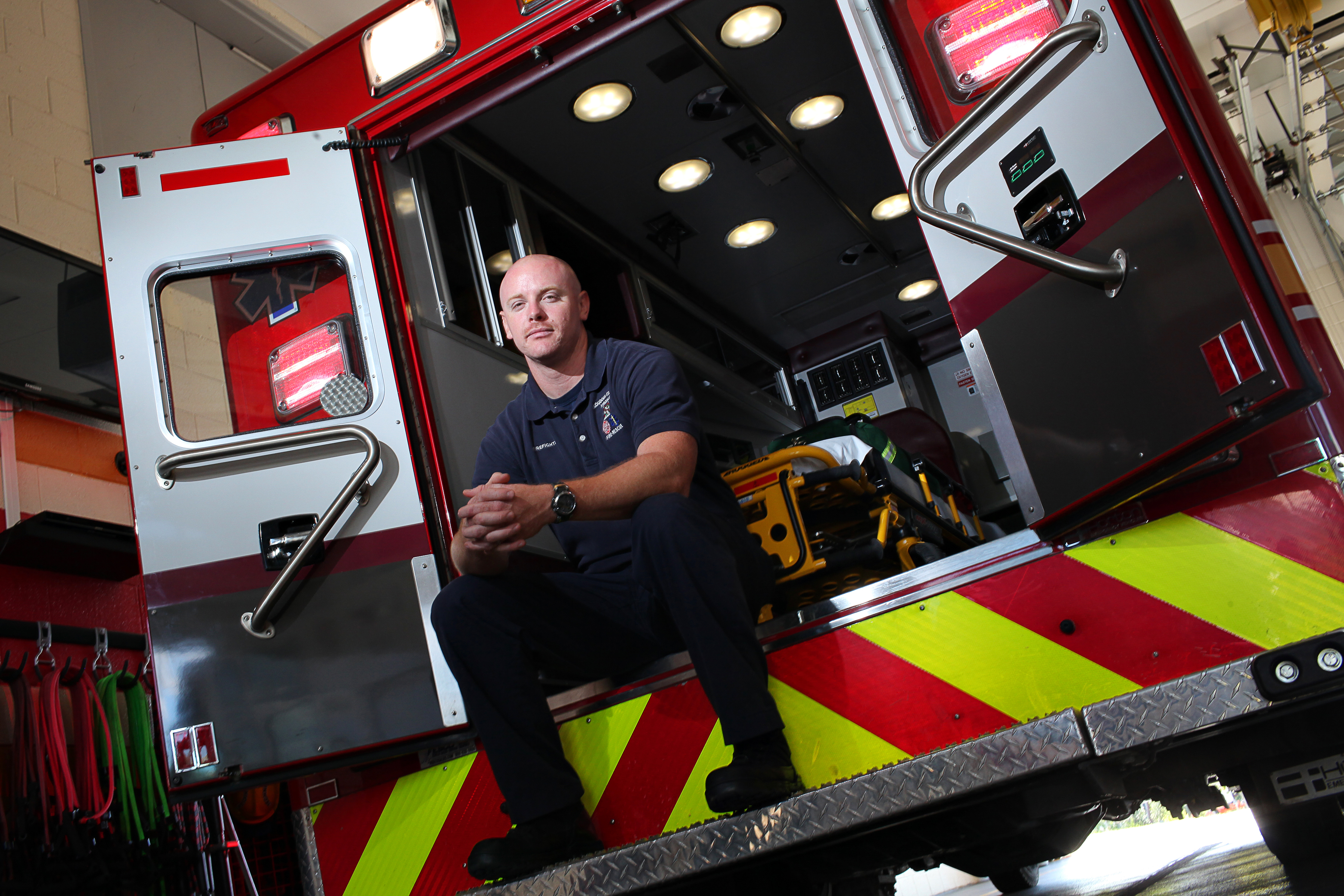 Bathed in warm artificial light, a paramedic sits at the rear of an ambulance, exuding calm confidence amidst the chaos of his profession. The striking red and yellow stripes of the vehicle contrast with his dark uniform, highlighting his role as a protector in times of crisis. The composition draws the viewer's gaze into the interior of the ambulance, symbolizing readiness and service.