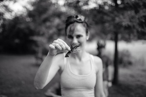 In this black and white photograph, a woman proudly holds a small plant in her hand, showcasing curiosity and joy in her expression. The blurred background hints at a tranquil outdoor setting, while dappled light filters through the trees, creating a soft and inviting mood. The focus on her gesture invites the viewer to share in her moment of discovery and connection with nature.
