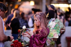 In a bustling outdoor setting, a young woman adorned with shimmering, translucent wings delicately arranges roses while lost in thought. The warm, ambient lighting casts a soft glow, enhancing the ethereal quality of her presence amidst the crowd. The contrast between her focused demeanor and the lively background evokes a sense of magic and introspection.