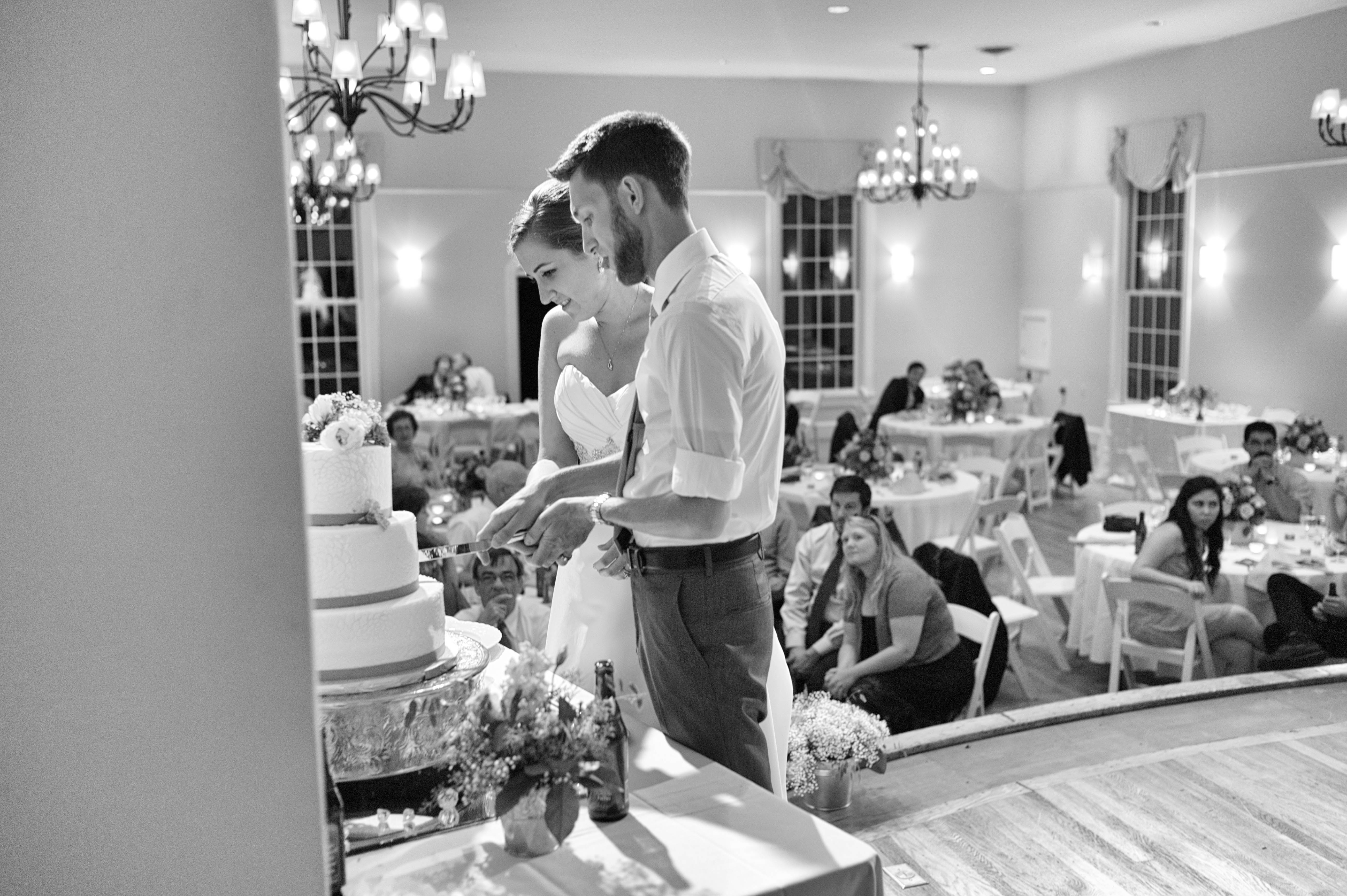 In this intimate black-and-white photograph, a couple shares a tender moment as they cut their wedding cake, symbolizing the start of their journey together. The soft lighting and the elegantly set tables in the background create a warm, celebratory atmosphere, while the attentive guests look on, capturing the joy of the occasion. The focus on the couple against the blurred backdrop adds depth and emphasizes their connection amidst the lively celebration.
