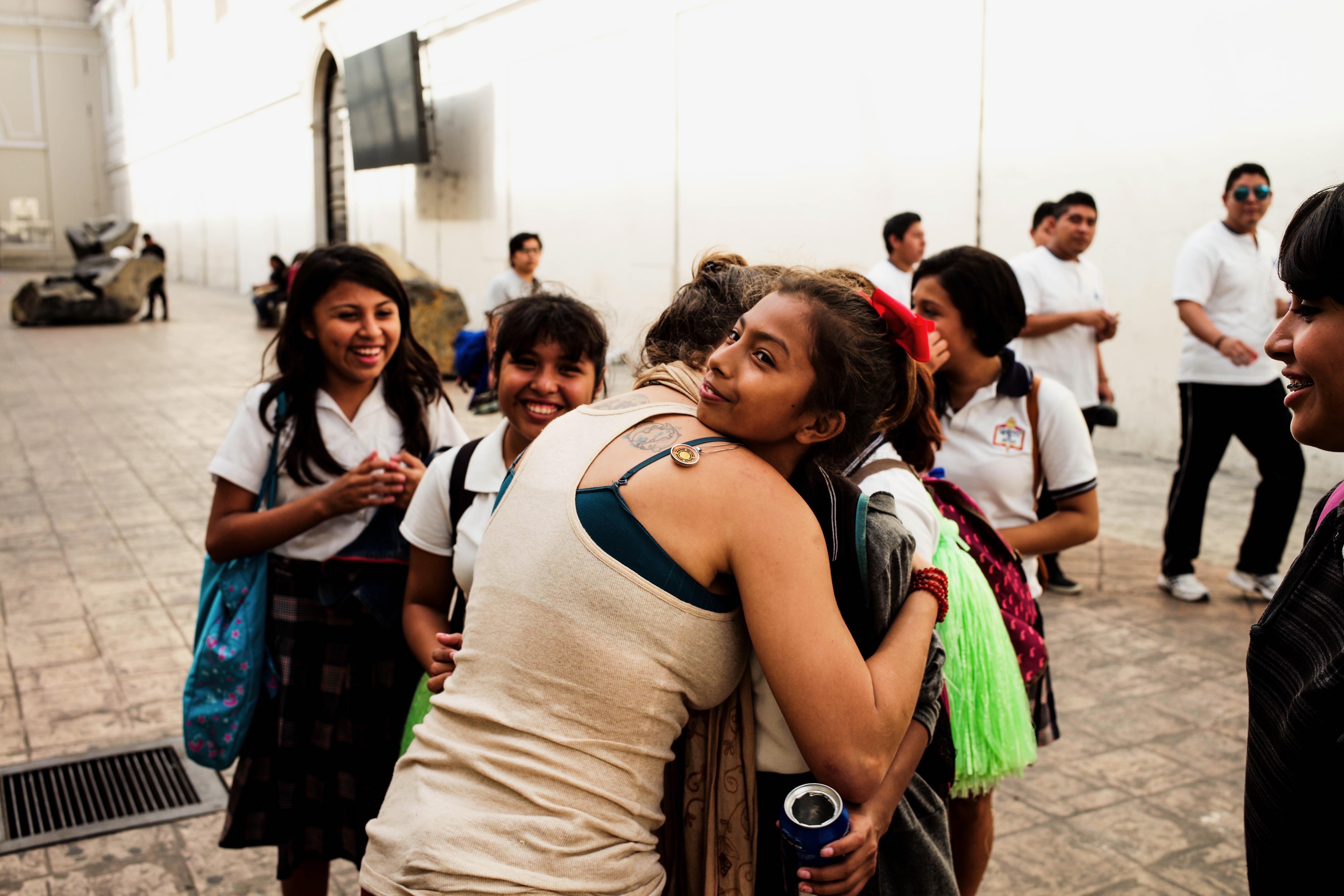 In a lively courtyard, a group of young girls shares a heartfelt moment of connection, their laughter echoing in the air. The embrace between two friends highlights the warmth and joy of camaraderie, while the soft afternoon light envelops them, creating a vibrant and inviting atmosphere. The bustling background adds a sense of community, emphasizing the bonds of friendship and the spirit of celebration.