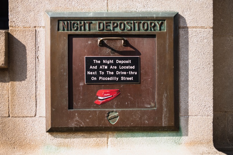 This photograph captures a vintage night depository mounted against a textured stone wall, merging functionality with street aesthetics. The bold signage, framed by green metal, directs the viewer's attention to a whimsical red stapler, adding a playful contrast to the otherwise serious tone. The warm sunlight bathes the scene, enhancing the textures and highlighting the unique juxtaposition of urban elements.