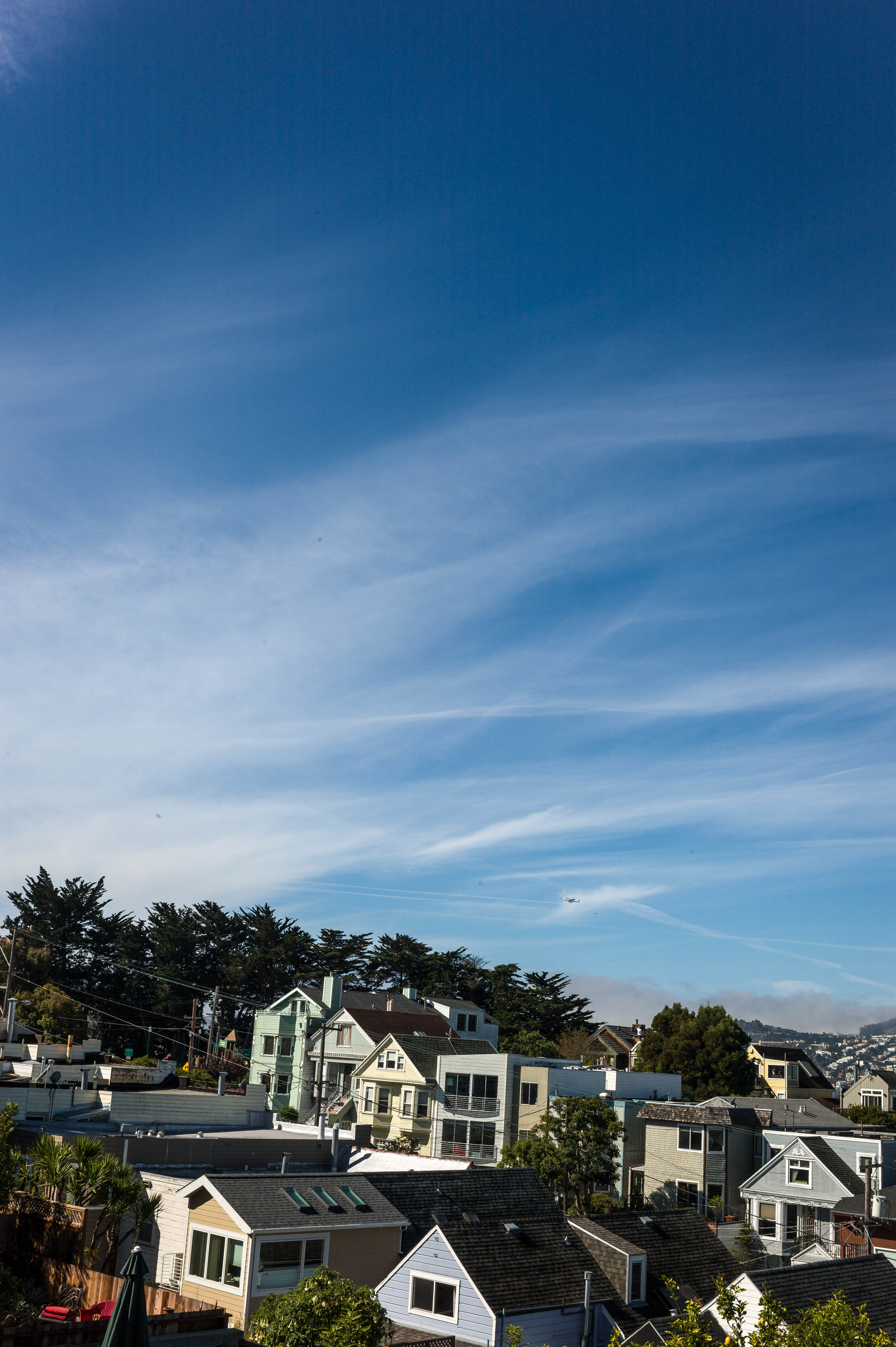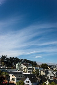 The photograph captures a charming residential area with a variety of homes nestled against a backdrop of expansive blue skies streaked with wispy clouds. The vibrant colors of the houses, complemented by lush greenery, evoke a sense of tranquility and suburban comfort. Bright, natural light enhances the inviting atmosphere, inviting the viewer to explore this serene neighborhood.