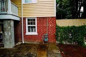 This photograph captures a quiet urban corner, showcasing a weathered brick wall juxtaposed with a pale yellow siding. The composition balances textures, from the rough brick and smooth paint to the creeping ivy that softens the scene, creating a serene yet vibrant mood. Natural light gently highlights these contrasts, inviting a sense of nostalgia and warmth to this everyday setting.