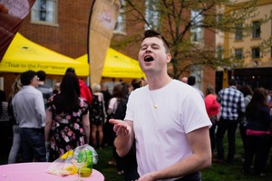 In this lively outdoor scene, a man dressed in a simple white t-shirt joyfully tosses popcorn into his mouth, encapsulating the playful spirit of a festival atmosphere. The vibrant yellow canopies in the background contrast with the social bustle of onlookers, creating a sense of excitement and camaraderie. Soft natural light enhances the cheerful mood, illuminating his expression of delight amidst the gathering crowd.