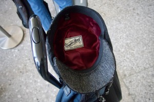 This photograph captures a close-up view of a stylish cap placed on top of a piece of luggage in an airport setting. The warm, rich interior of the cap contrasts with the cool, metallic tones of the suitcase, evoking a sense of adventure and exploration. The composition hints at the anticipation of travel, as the blurry figures in the background suggest a bustling airport atmosphere.