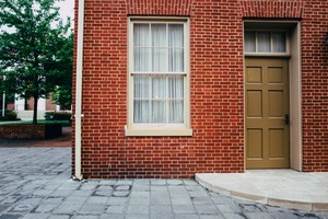 The photograph captures a simple yet striking facade of a brick building, featuring a prominent window bordered by soft, flowing curtains and a sturdy, unadorned door. The warm tones of the brick and muted colors of the door contrast with the cool, serene atmosphere created by the surrounding green trees. The composition emphasizes symmetry and minimalism, inviting contemplation of the everyday beauty found in urban architecture.