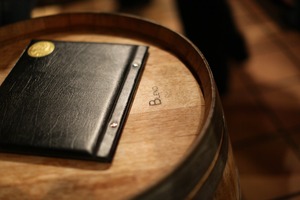The photograph captures a sleek black menu resting atop a rustic wooden barrel, embodying a blend of sophistication and rustic charm. Soft, warm lighting creates an inviting ambiance, enhancing the earthy textures of the barrel and the glossy finish of the menu. The focus on the elements draws the viewer's eye, evoking a sense of anticipation for a delightful experience ahead.