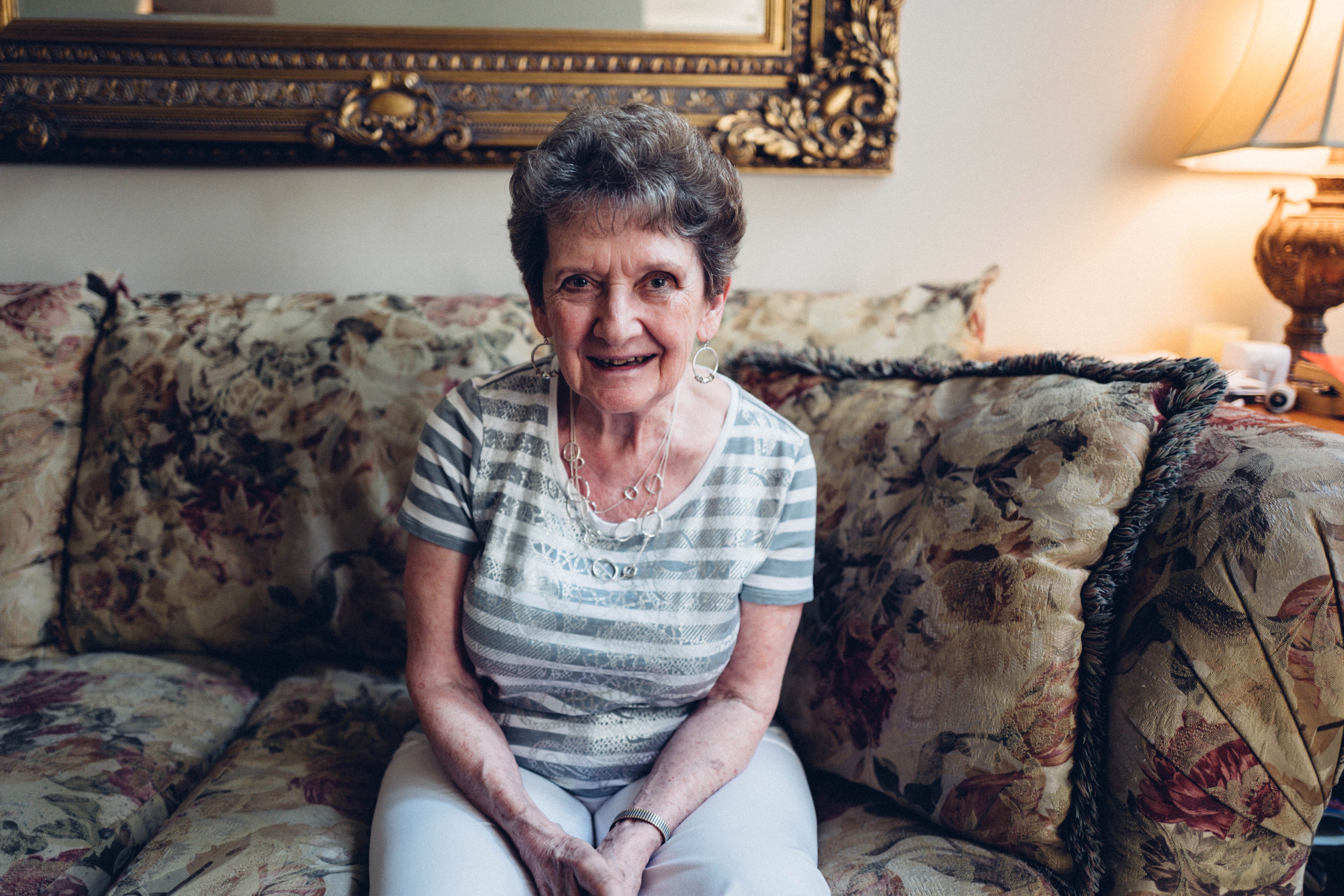 In a cozy living room adorned with floral upholstery, an elderly woman sits on a couch, her warm smile radiating joy and kindness. The soft, warm lighting bathes her in a gentle glow, creating an intimate and inviting atmosphere that captures a moment of cherished connection and nostalgia.