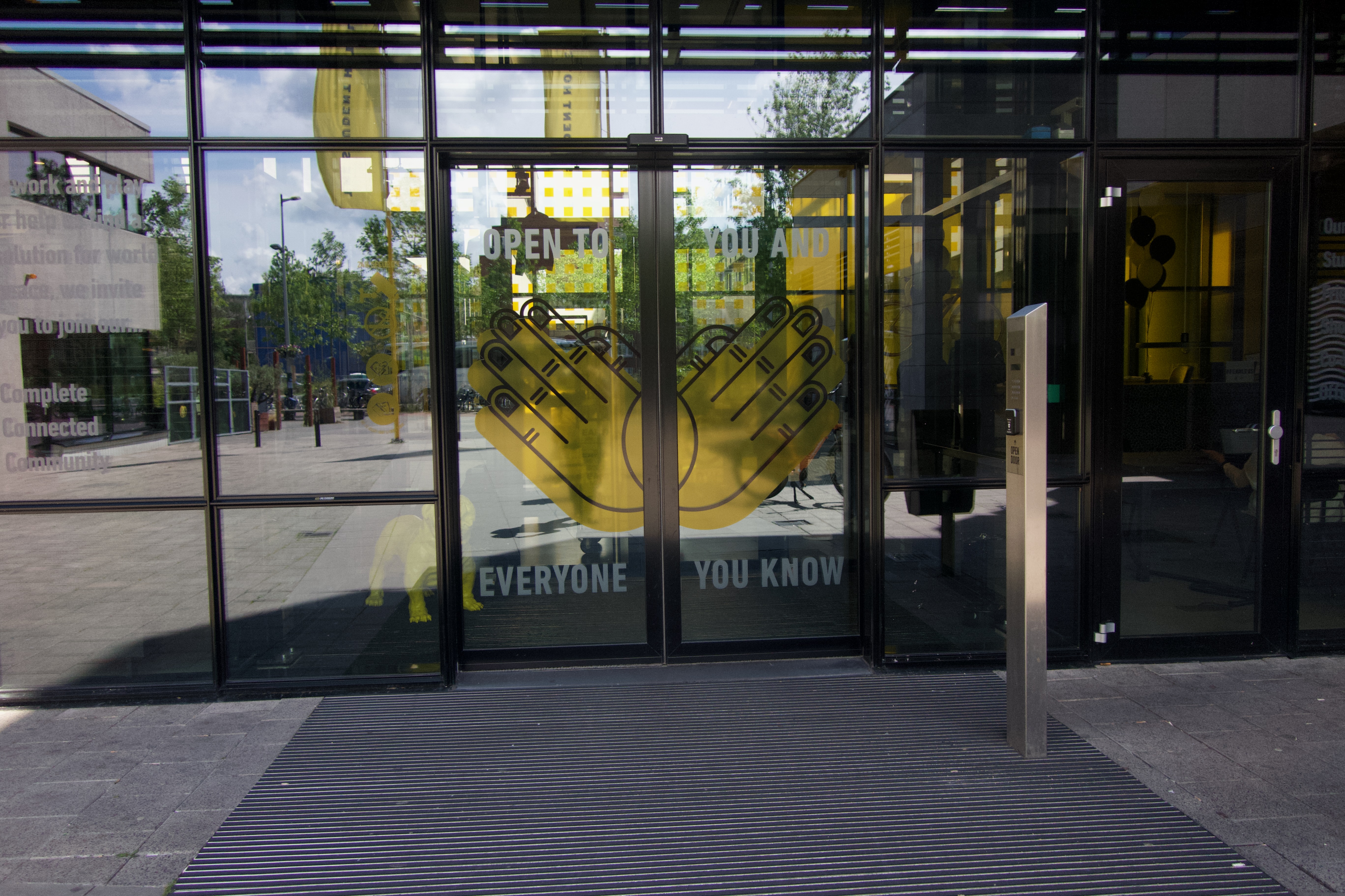 The photograph features a glass entrance adorned with an inviting graphic of two open hands, symbolizing openness and community. Bright yellow hues and modern architectural lines create a warm, welcoming atmosphere, contrasting with the sleek transparency of the glass. The interplay of light enhances the cheerful mood, while the clear message on the door beckons passersby to enter.