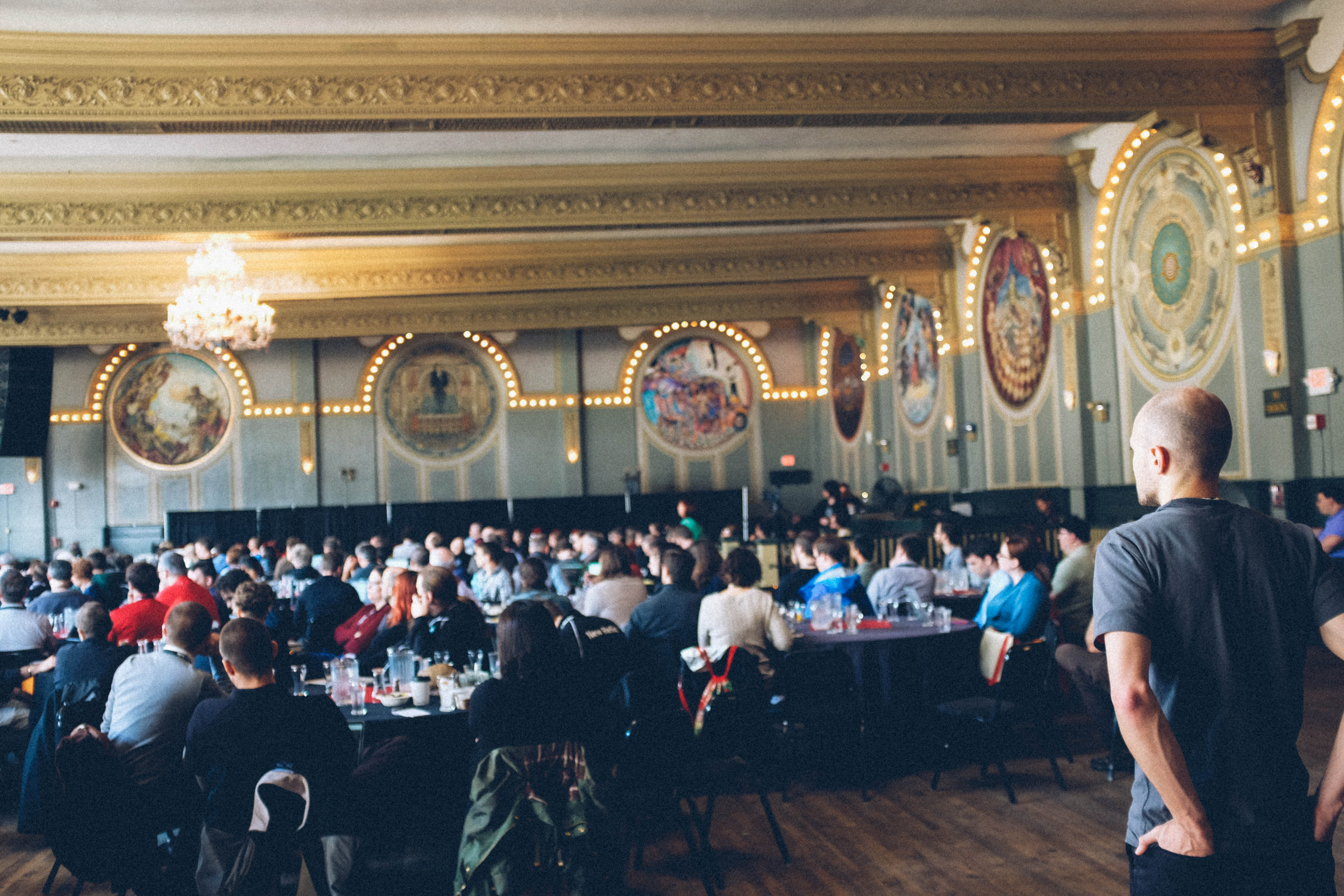 In a beautifully decorated hall filled with soft ambient lighting, a large audience is engaged in a gathering, suggesting a mix of anticipation and camaraderie. The intricate details of the architecture and artwork bring a sense of history, while the figure in the foreground watching pensively adds a contemplative mood to the scene. The overall atmosphere blends elegance with the buzz of conversation, creating an inviting yet reflective environment.