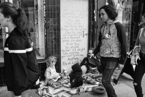 In this black-and-white photograph, a juxtaposition of busy pedestrians and a solitary duo on the ground creates a contrast of experiences. The young girl strums a ukulele, while her companion sits quietly, evoking a sense of innocence amid the city's hustle. Dim street lighting adds a melancholic mood, highlighting the fractured connections between passersby and those living on the margins.