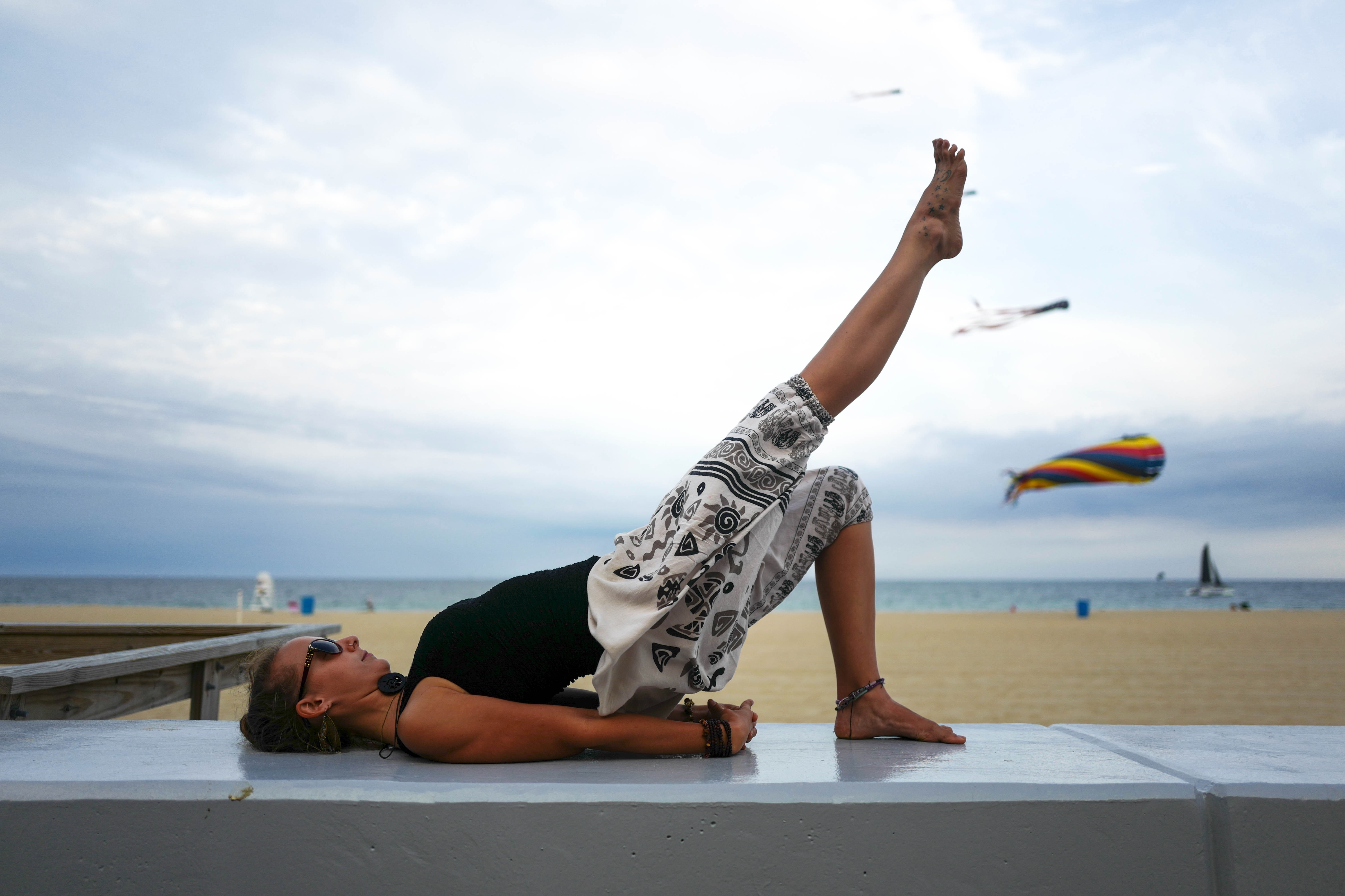 A relaxed figure reclines on a ledge in a coastal setting, one leg playfully lifted towards the sky. The moody, overcast sky adds an air of tranquility, while colorful kites drift in the background, infusing the scene with a whimsical touch. The composition balances the subject against the expansive beach and ocean, creating a moment of serene leisure.