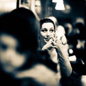 In a dimly lit café, a woman captivates with her expressive gestures and enigmatic smile, her hands dancing through the air. The soft focus on the surrounding figures creates an intimate ambiance, drawing attention to her lively conversation against the backdrop of indistinct chatter. The blue-toned lighting adds a moody warmth, enhancing the sense of connection and intrigue in this vibrant scene.