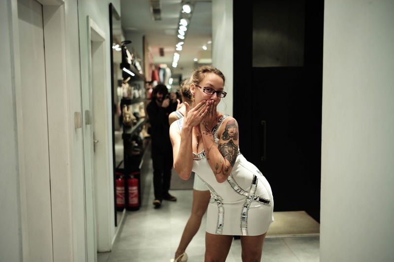 A playful young woman dressed in a sleek white dress strikes a fun pose in a fashion store's corridor, her surprised expression radiating joy. The lighting is soft and warm, creating an inviting atmosphere amidst the contemporary backdrop filled with clothing displays. Another figure lingers in the background, adding to the candid nature of the moment, enhancing the sense of spontaneity.
