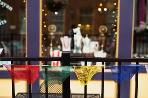 This photograph captures a vibrant display of prayer flags in red, green, yellow, and blue, fluttering gently against a backdrop of an artistic shop window glowing with soft lights. The focus on the flags creates a sense of warmth and cultural richness, inviting a contemplative mood. The depth of field blurs the shop’s interior, emphasizing the vivid colors of the flags and enhancing the overall charm and intimate feel of the scene.