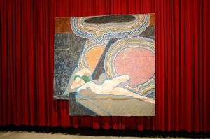 A striking artwork depicts a reclining figure, whose soft lines contrast with the vivid, swirling colors of the background. The composition is framed by rich crimson drapery, evoking passion and intensity, while the use of light subtly highlights the figure's form. This bold juxtaposition creates an intriguing interplay of warmth and abstraction, inviting viewers into a dreamlike state.