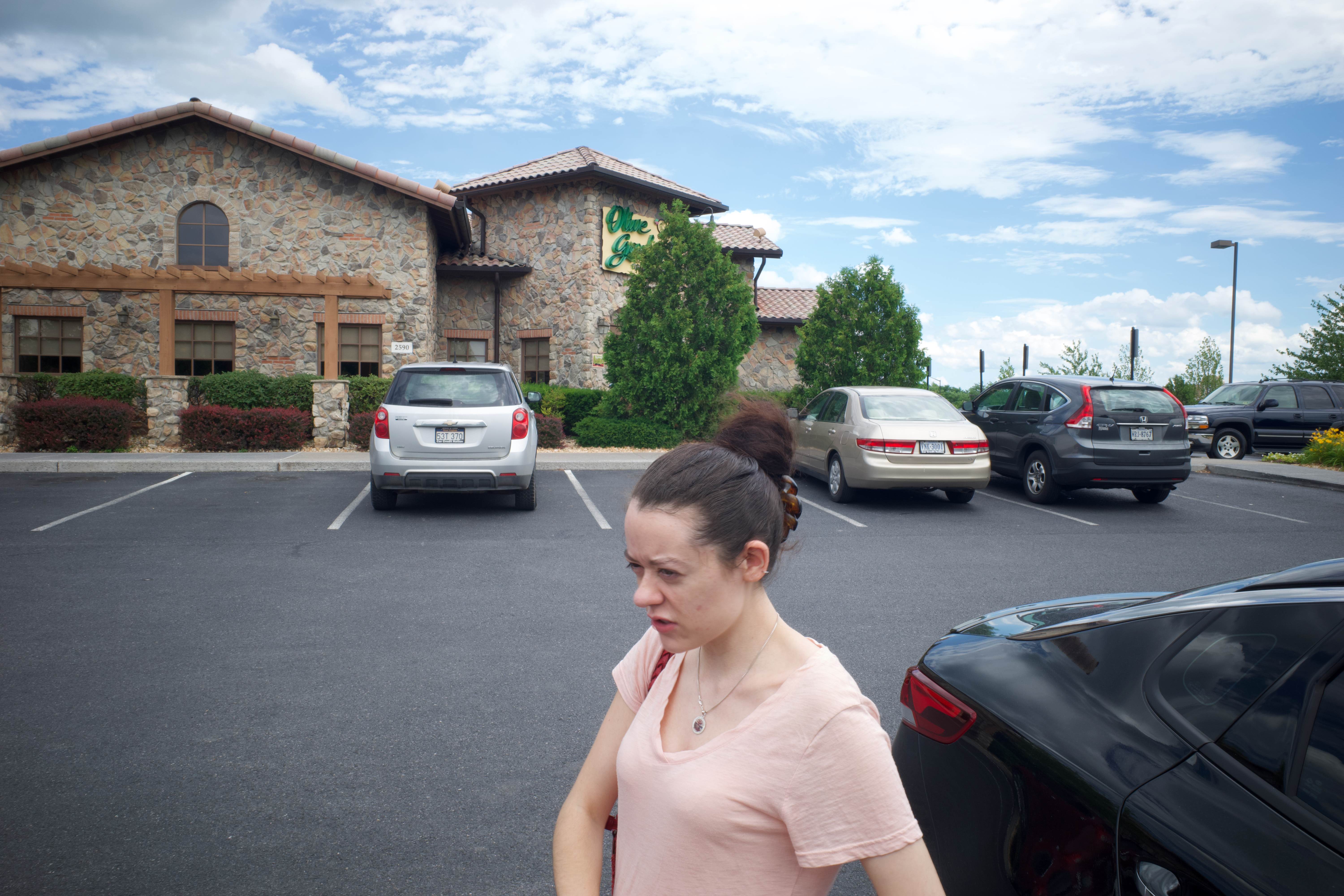 In this candid shot, a young woman stands slightly out of focus in the foreground, her expression one of contemplation or concern. The bright daylight illuminates the scene, contrasting the warm stone texture of the restaurant behind her, while the empty parking lot adds to a sense of solitude. A blend of cloud patterns in the sky hints at an approaching change, mirroring the woman's introspective mood.