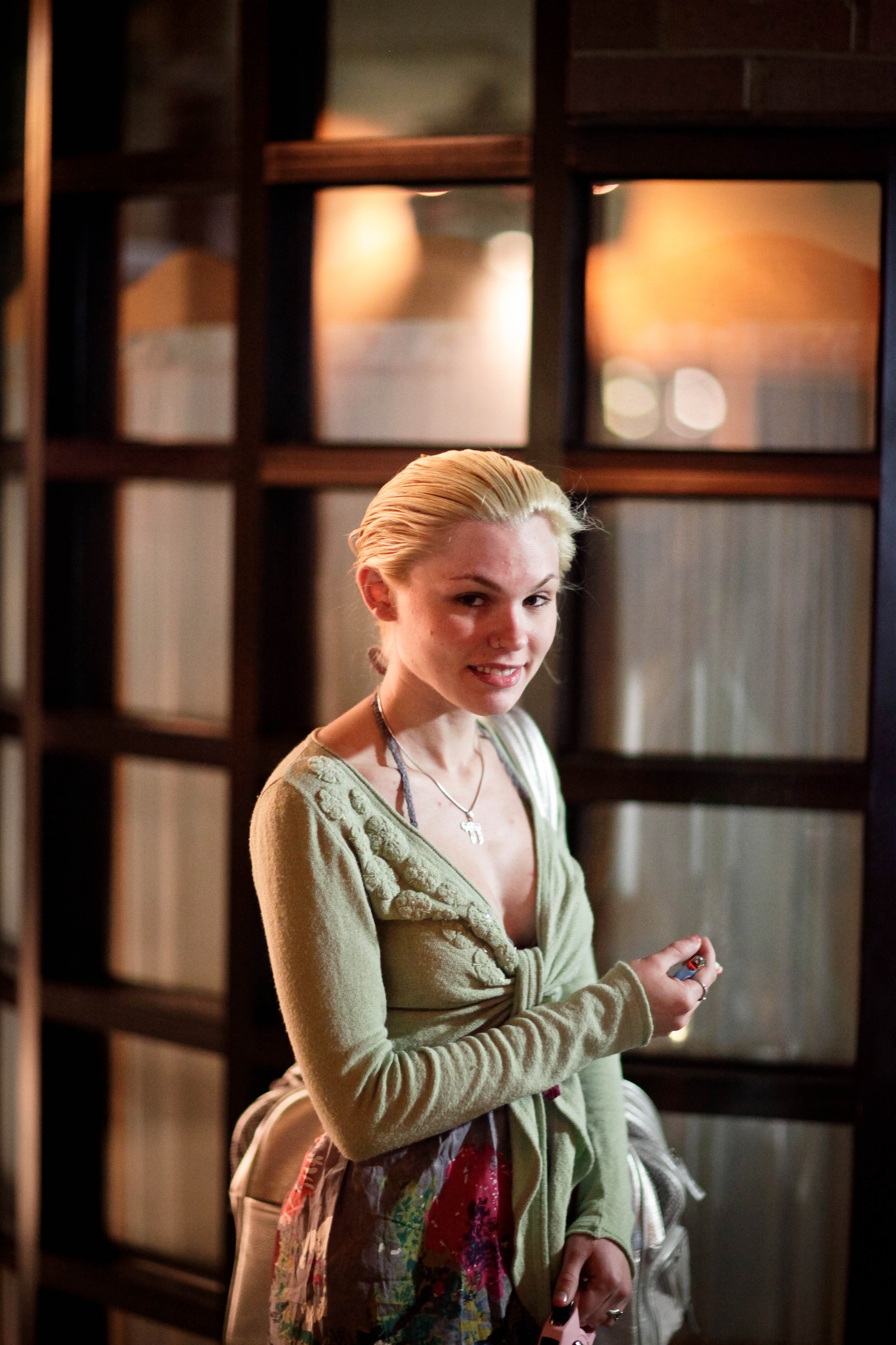 The photograph captures a young woman standing against a backdrop of glass panes, her expression a mix of shyness and curiosity. Soft lighting enhances her features, creating a warm atmosphere that contrasts with the cool tones of her outfit. The composition draws the eye to her engaging smile, inviting viewers into a moment of spontaneous connection.