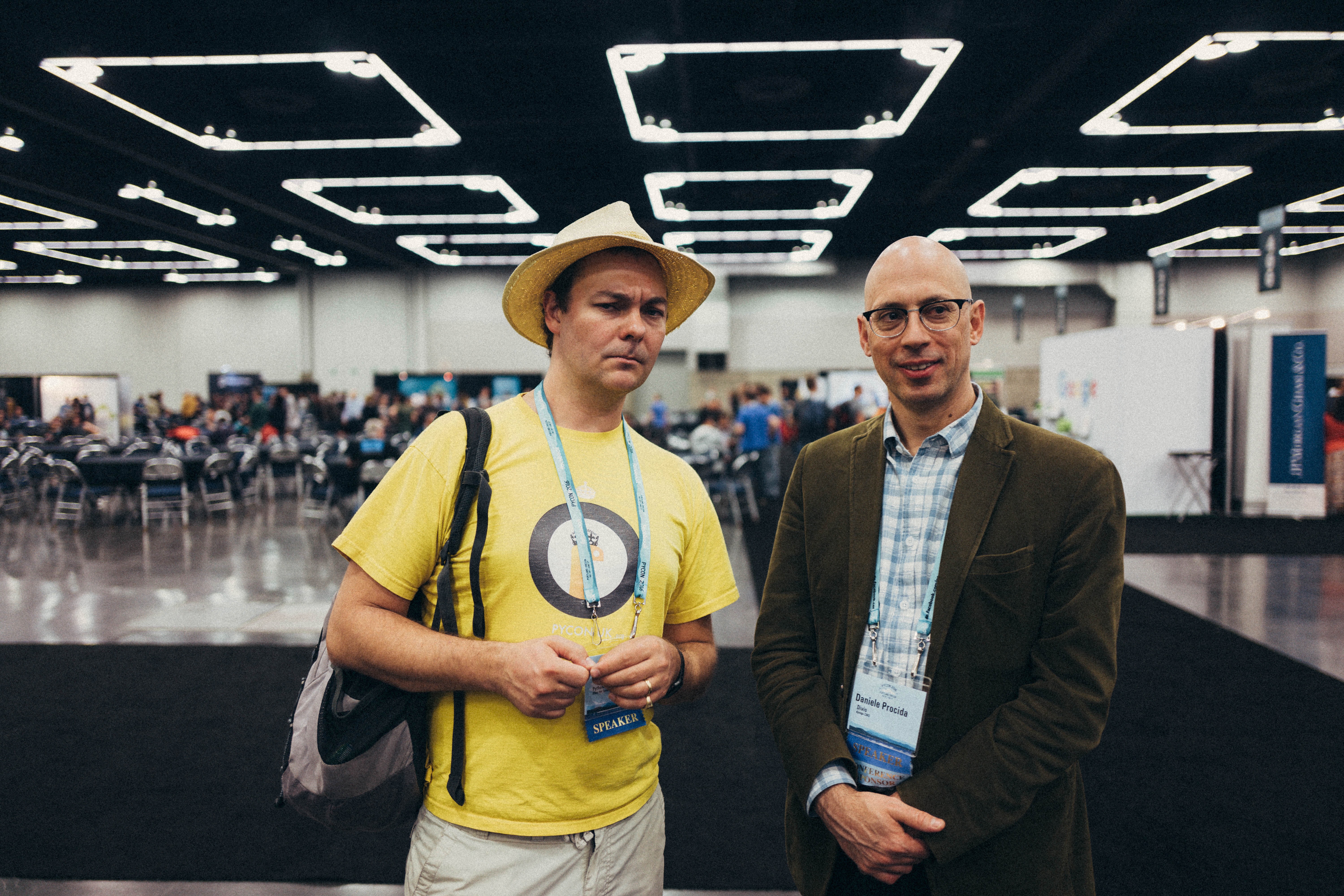 In this candid shot, two individuals stand in a spacious convention center, exuding a mix of curiosity and confidence. The bright, fluorescent lighting contrasts with their relaxed attire, creating a vibrant yet professional atmosphere that hints at innovation and collaboration.
