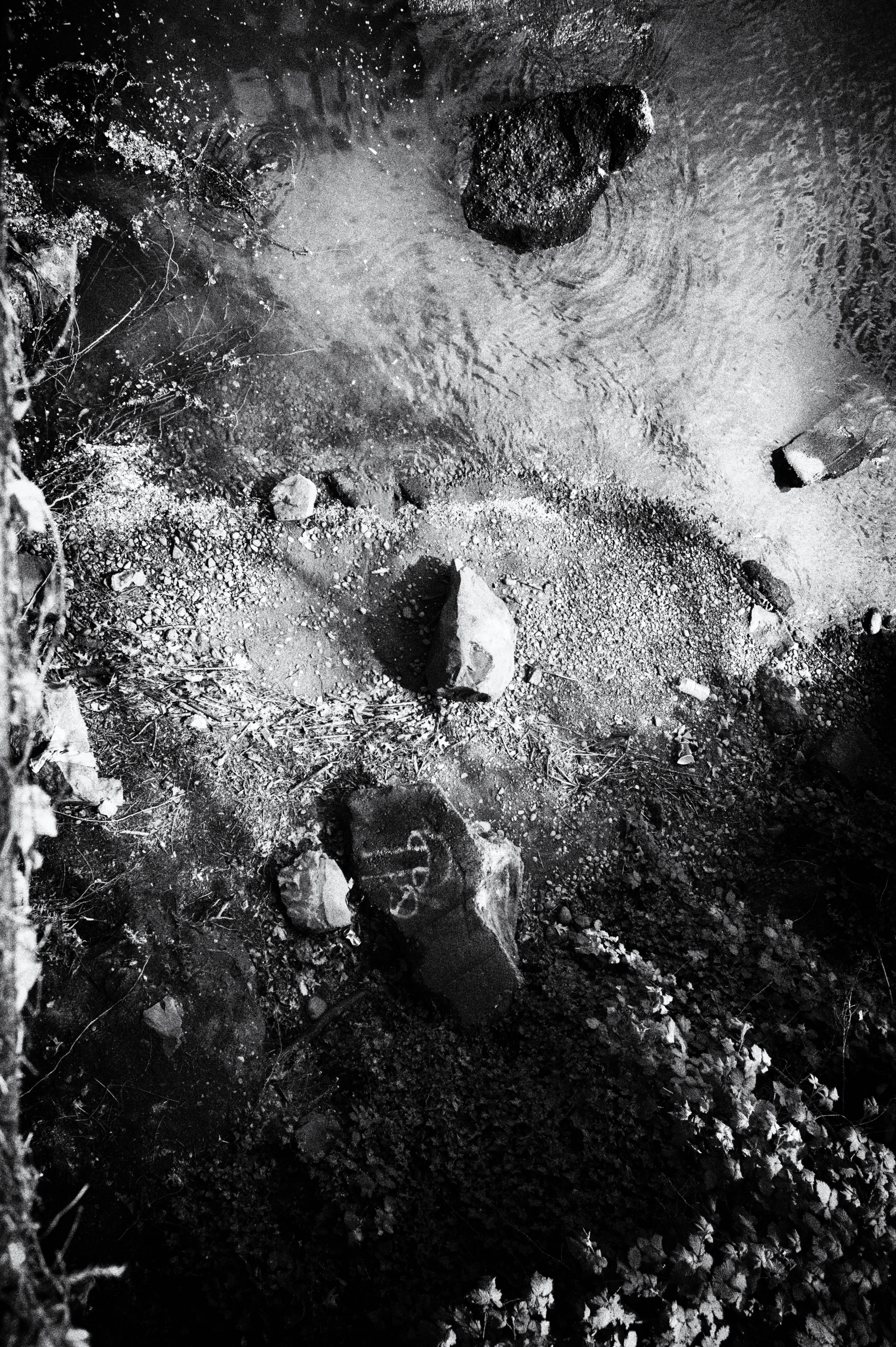 This monochromatic photograph captures a serene riverbank, viewed from above, where smooth rocks are nestled beside gentle ripples on the water’s surface. The interplay of light and shadow creates a tranquil yet mysterious atmosphere, inviting contemplation of the natural world. Sparse vegetation clings to the edges, adding texture and depth to the composition.