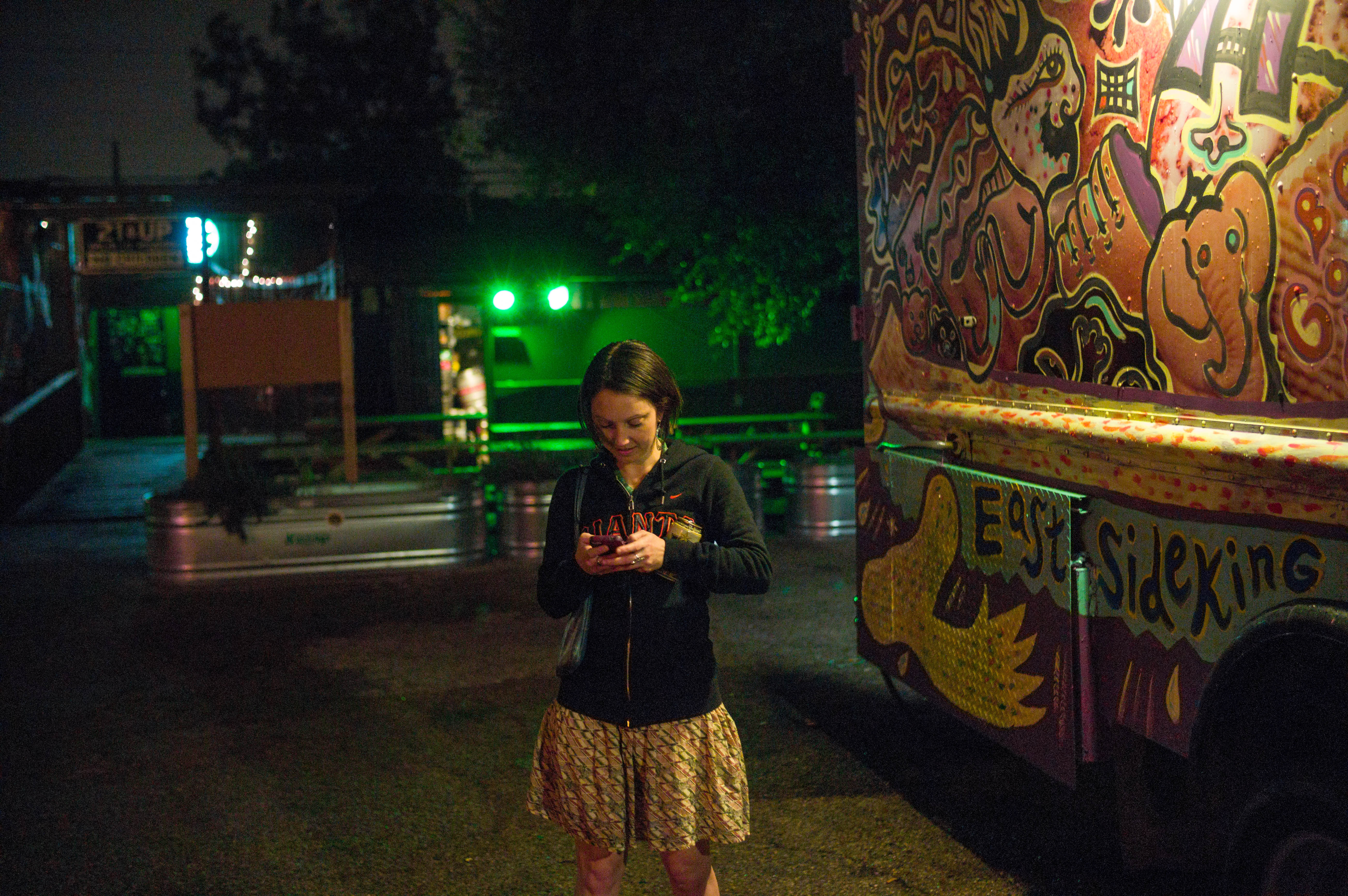 A young woman stands alone in a dimly lit outdoor setting, absorbed in her phone as the vibrant colors of a nearby food truck illuminate the scene. The contrasting light creates a sense of isolation amidst the chaotic backdrop of graffiti, capturing a moment of introspection on a lively night. The soft focus of the surrounding darkness emphasizes her solitude, offering a glimpse into a personal bubble within a bustling environment.