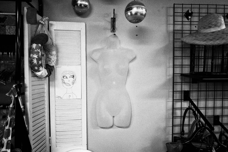 This black-and-white photograph captures a still life of forgotten objects, centered on a translucent mannequin that stands alone against a backdrop of eclectic items. The muted tones and soft lighting create an air of nostalgia, evoking a sense of quiet reflection within the cluttered space. A hand-drawn portrait nearby adds an element of whimsy and contrasts sharply with the mannequin’s stark presence, inviting viewers to ponder the stories intertwined within the scene.