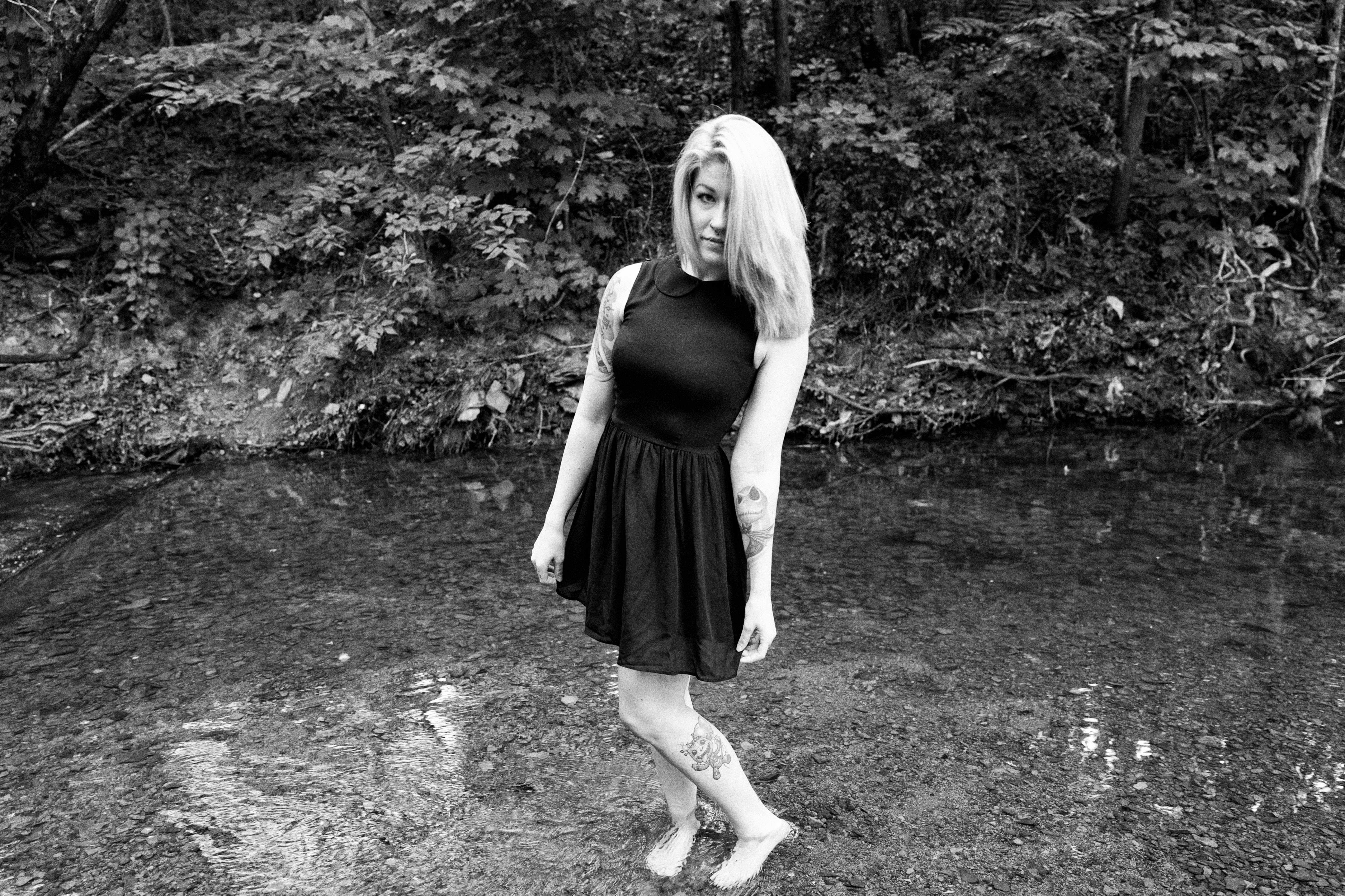 In this evocative black-and-white photograph, a woman stands barefoot in shallow water, surrounded by lush greenery. Her confident yet contemplative pose contrasts with the peacefulness of the natural setting, creating a sense of introspection. The soft lighting enhances the serene mood, while the reflection on the water adds depth to the composition.