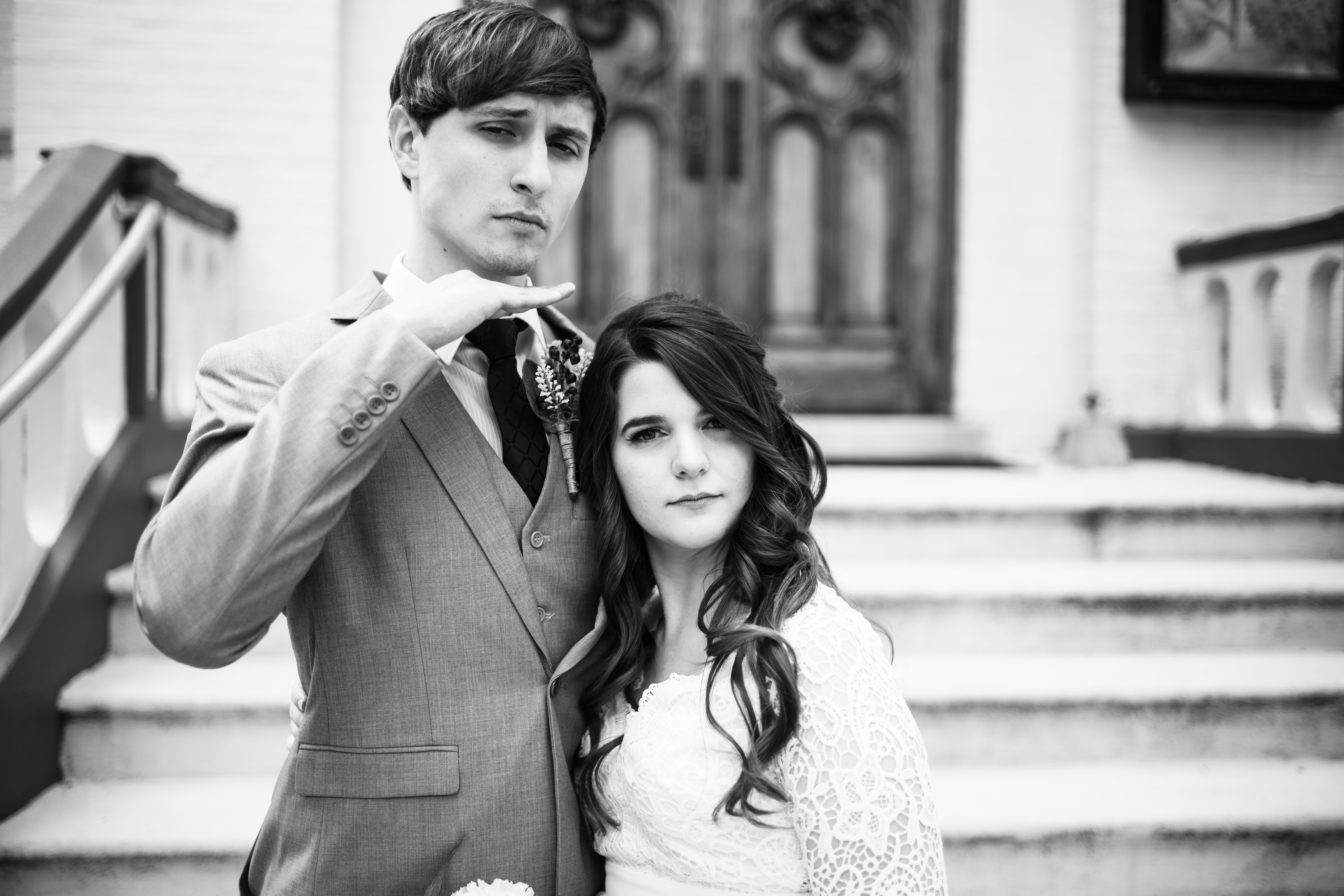 In this striking black and white portrait, a couple poses confidently against an architectural backdrop. The groom, dressed in a sharp suit, exudes a playful bravado while the bride, in a delicate lace gown, provides a warm, assertive contrast. Soft lighting enhances their expressions, capturing a moment filled with deep affection and an air of sophistication.