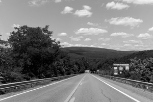 A long stretch of empty road cuts through lush greenery, leading towards distant, undulating hills beneath a sky filled with puffy clouds. The black-and-white treatment enhances the serene, timeless quality of the scene, evoking a sense of adventure and reflection. The signage in the frame hints at the promise of new experiences just beyond the horizon.