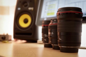 The photograph captures a collection of camera lenses lined up on a sleek surface, with a sound monitor and computer screen softly blurred in the background. The warm, natural light filters through, creating a mood of inspiration and focus, perfect for a creative workspace. The contrasting textures and shapes of the equipment emphasize both artistry and technique.