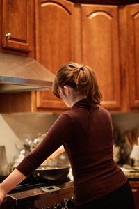 A young woman, seen from behind, is attentively cooking in a warmly lit kitchen, radiating a sense of calm and focus. The rich wood tones of the cabinets contrast beautifully with the soft illumination, creating a cozy, inviting atmosphere. The composition centers on her delicate movements, emphasizing the intimate act of cooking in a familiar space.