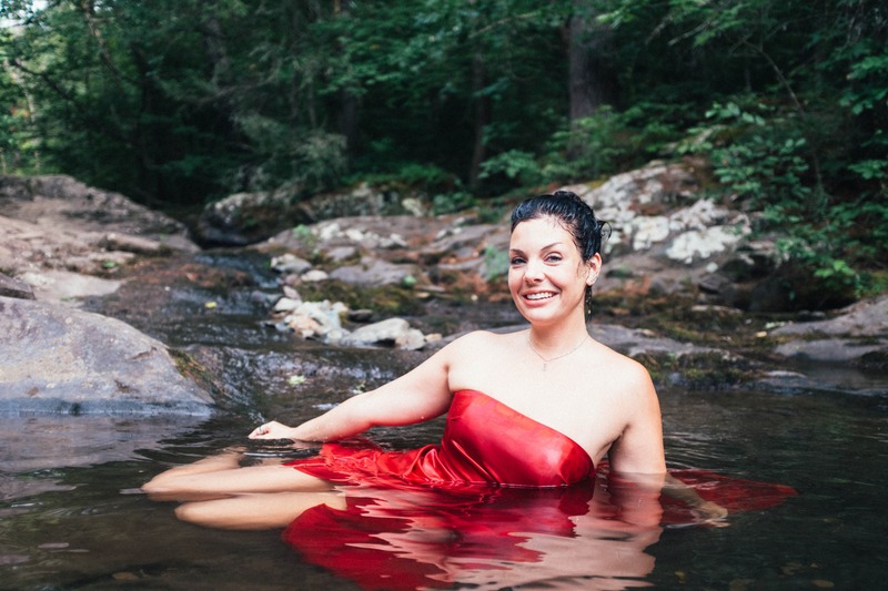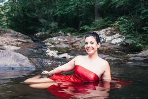 A woman in a flowing red dress sits gracefully in a tranquil stream, her relaxed posture radiating serenity. Surrounded by lush greenery, the soft, dappled lighting highlights her natural beauty and creates a harmonious connection with the idyllic setting. Her cheerful smile adds a touch of joy, inviting the viewer to share in this peaceful moment.