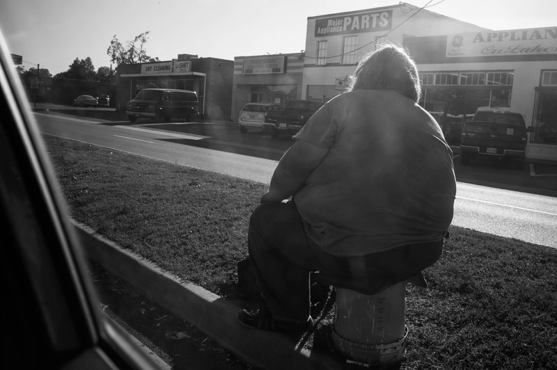 A solitary figure sits pensively on a fire hydrant, framed by the muted bustle of a commercial street. The strong backlight casts a silhouette, enhancing the sense of isolation and introspection. Sharp contrasts in the black-and-white composition evoke a mood of quiet contemplation against the urban backdrop.