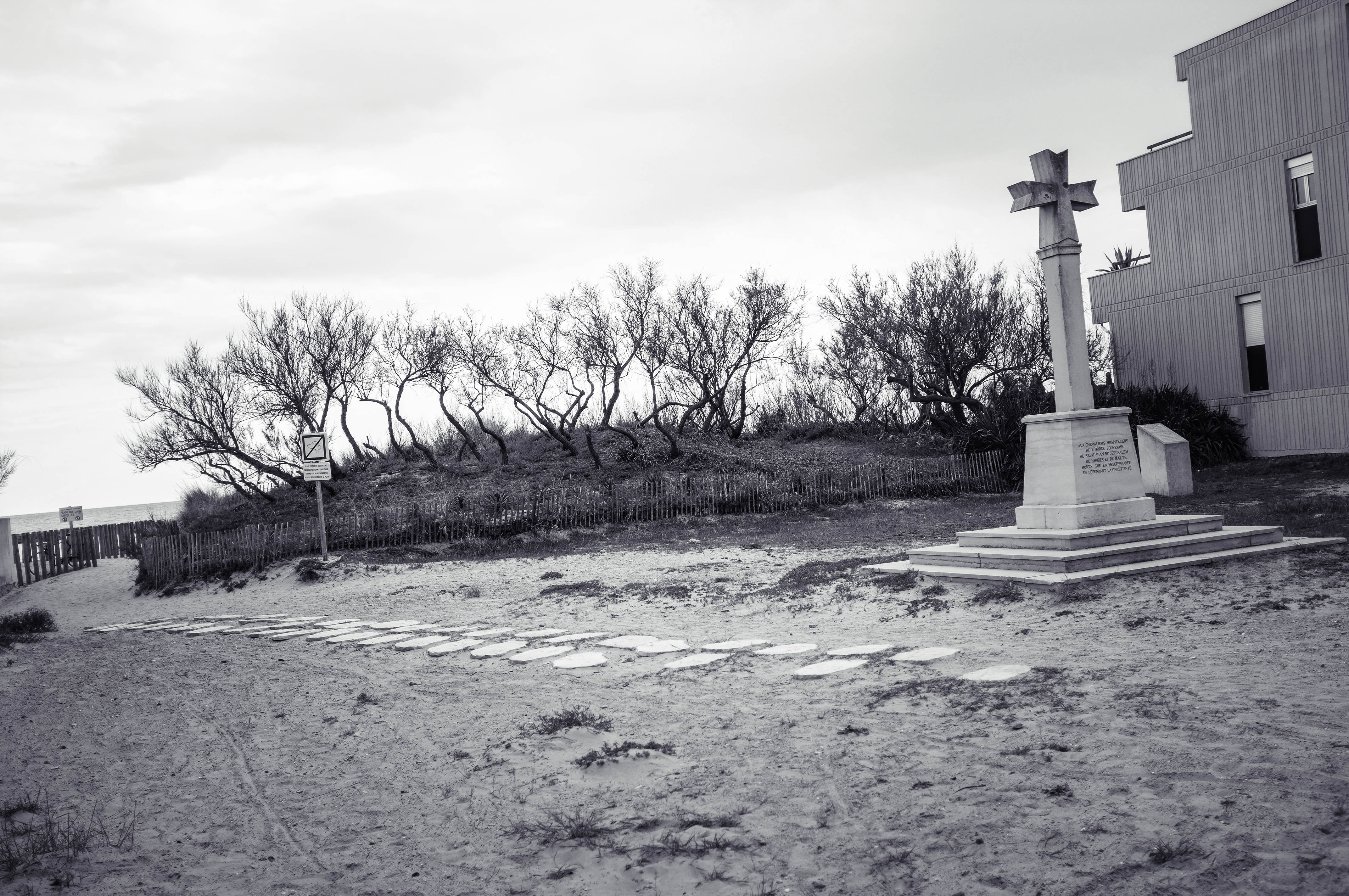 This monochromatic photograph captures a solemn memorial cross set against a backdrop of windswept trees and an overcast sky. The composition is anchored by the path of stone slabs leading toward the cross, inviting contemplation amid an atmosphere of quiet reflection. The subdued lighting and stark contrast lend a melancholic charm, suggesting a connection to history and loss.