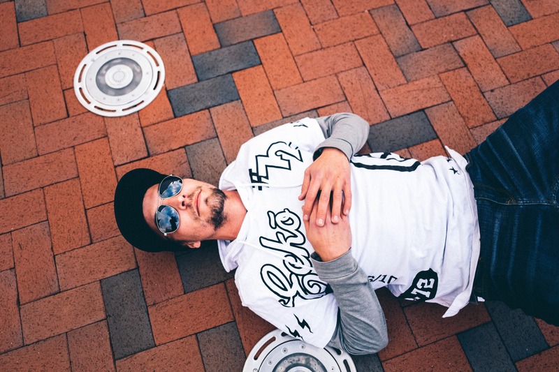 A young man reclines on a patterned brick surface, his sunglasses reflecting the world around him. The composition creates an intimate atmosphere, emphasizing his relaxed demeanor under soft, diffused light. Surrounded by circular shapes, the elements harmonize to evoke a sense of calm and introspection.