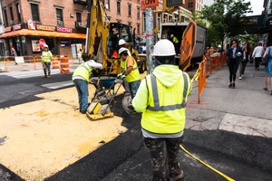A vibrant urban scene unfolds as workers clad in bright safety gear repair a section of the street, utilizing heavy machinery against a backdrop of bustling city life. The composition contrasts the focused laborers with indifferent pedestrians, capturing a sense of industriousness amidst the everyday chaos. Soft, natural light filters through the trees, creating an engaging atmosphere that highlights the dynamic interplay between work and leisure in the city.