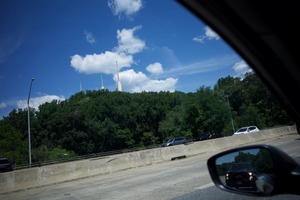This photograph captures a vibrant view from within a car, showcasing a distant tower rising majestically above a lush green landscape. The bright blue sky dotted with fluffy white clouds enhances the sense of freedom and adventure, while the reflections in the car window add depth and complexity to the scene. The juxtaposition of urban and natural elements evokes a feeling of exploration, inviting the viewer to contemplate the journey ahead.