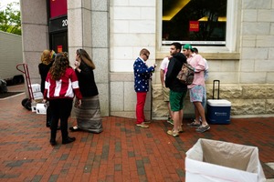 In this snapshot of city life, a group of casually dressed friends are engaged in animated discussion, contrasting their vibrant outfits with the muted tones of the surrounding architecture. The playful energy is highlighted by the whimsical, star-patterned jacket and the lively, multi-colored attire of the group. Soft natural light bathes the scene, creating a warm and inviting atmosphere as the city buzzes around them.