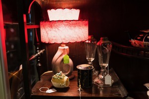 A quaint display of vintage items is illuminated by a warm pink lamp, casting a cozy glow over the scene. The soft lighting enhances the rich textures of antique glassware and ceramic pieces, evoking a sense of nostalgia. The careful arrangement of objects invites the viewer to explore the stories they hold, creating an intimate and reflective mood.