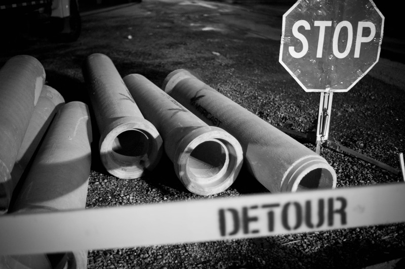This photograph captures a stark urban scene bathed in moody black and white. Concrete pipes lay haphazardly on the ground, framed by a looming 'STOP' sign and a 'DETOUR' barrier, creating a sense of obstruction and unease. The low lighting emphasizes the rough textures and shapes, evoking a feeling of abandonment and interrupted progress.