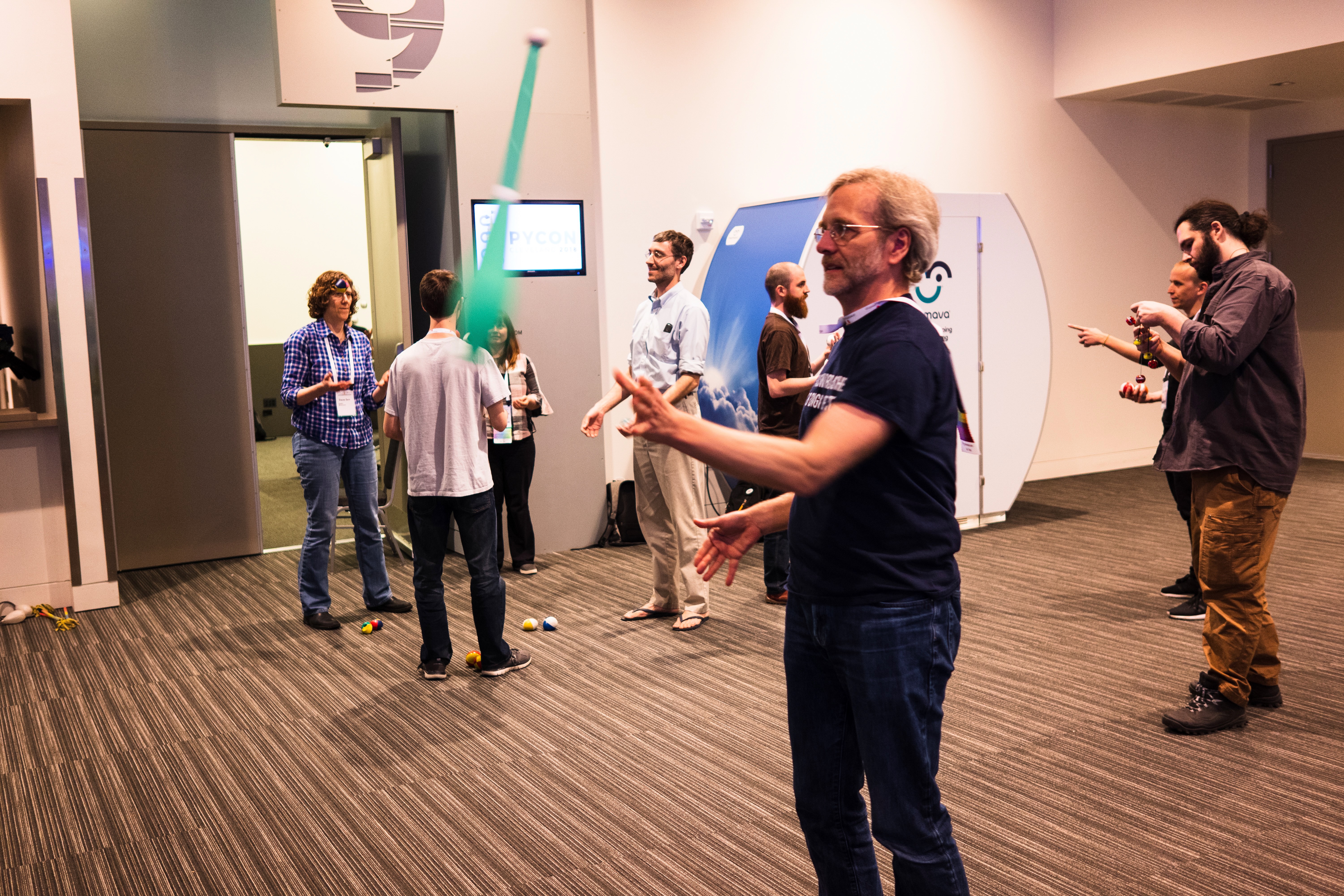 In a spacious indoor setting, a group of people engages in playful interactions, with one man confidently juggling a green object while others look on with amusement. The atmosphere feels lively and informal, enhanced by soft, diffused lighting that casts gentle shadows and highlights the focus on the juggler. The composition draws the eye to the center of activity, capturing a moment of shared joy and creativity among participants.