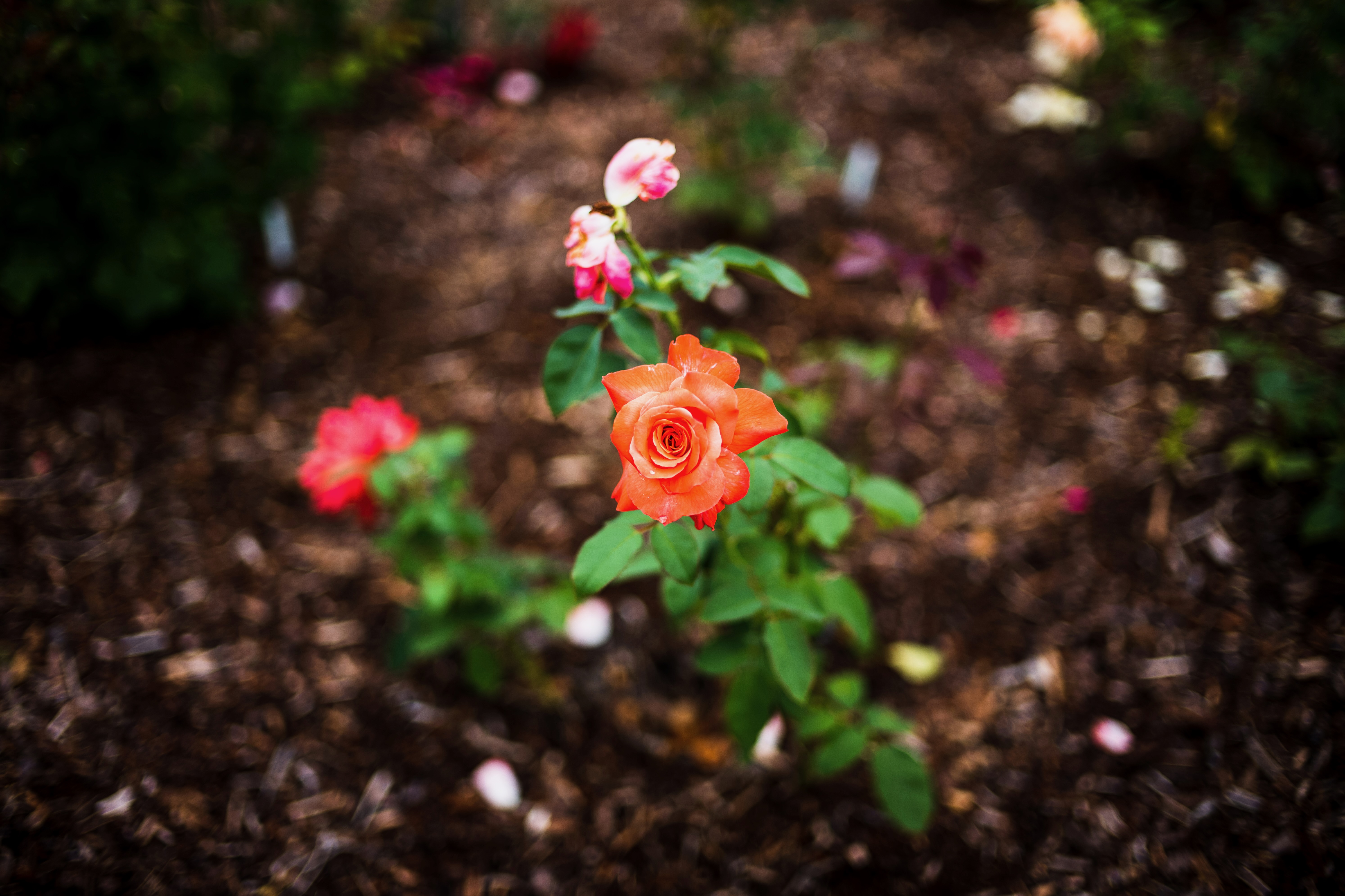 A vibrant orange rose stands proudly in a lush garden, surrounded by softly blurred blooms in various shades of pink and cream. The warm hues of the flower contrast beautifully with the earthy brown mulch, evoking a sense of vitality and warmth. Gentle, natural lighting enhances the freshness of the scene, creating a tranquil and inviting atmosphere.