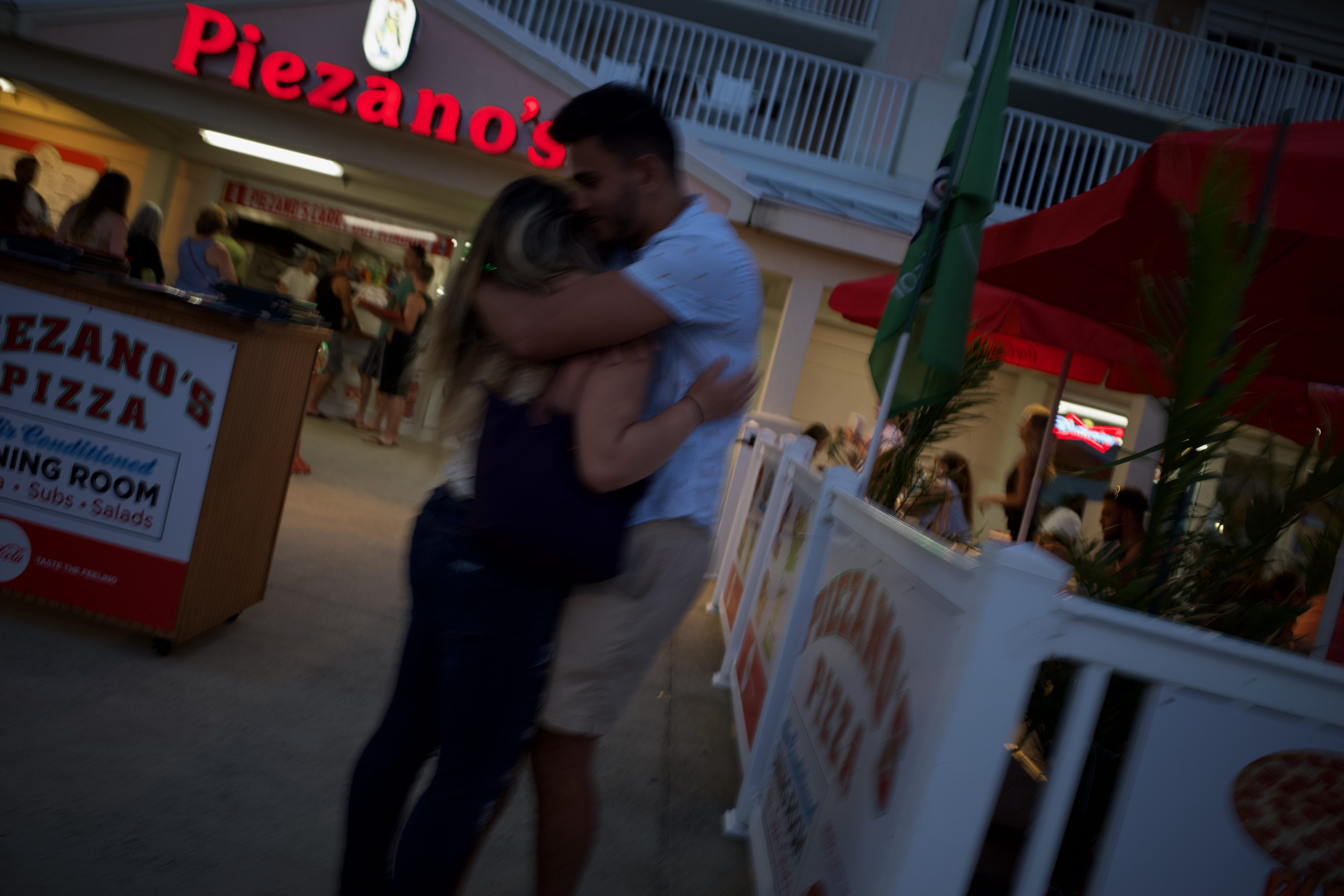 In the soft, ambient glow of the evening, a couple embraces tenderly outside Piezano's, their warmth contrasting against the bustling backdrop of the pizza joint. The blurred composition captures the energy of the surrounding crowd, while the vibrant red sign adds a playful charm to the scene. The intimate moment resonates with a sense of comfort and joy, highlighting the connection amidst the lively atmosphere.