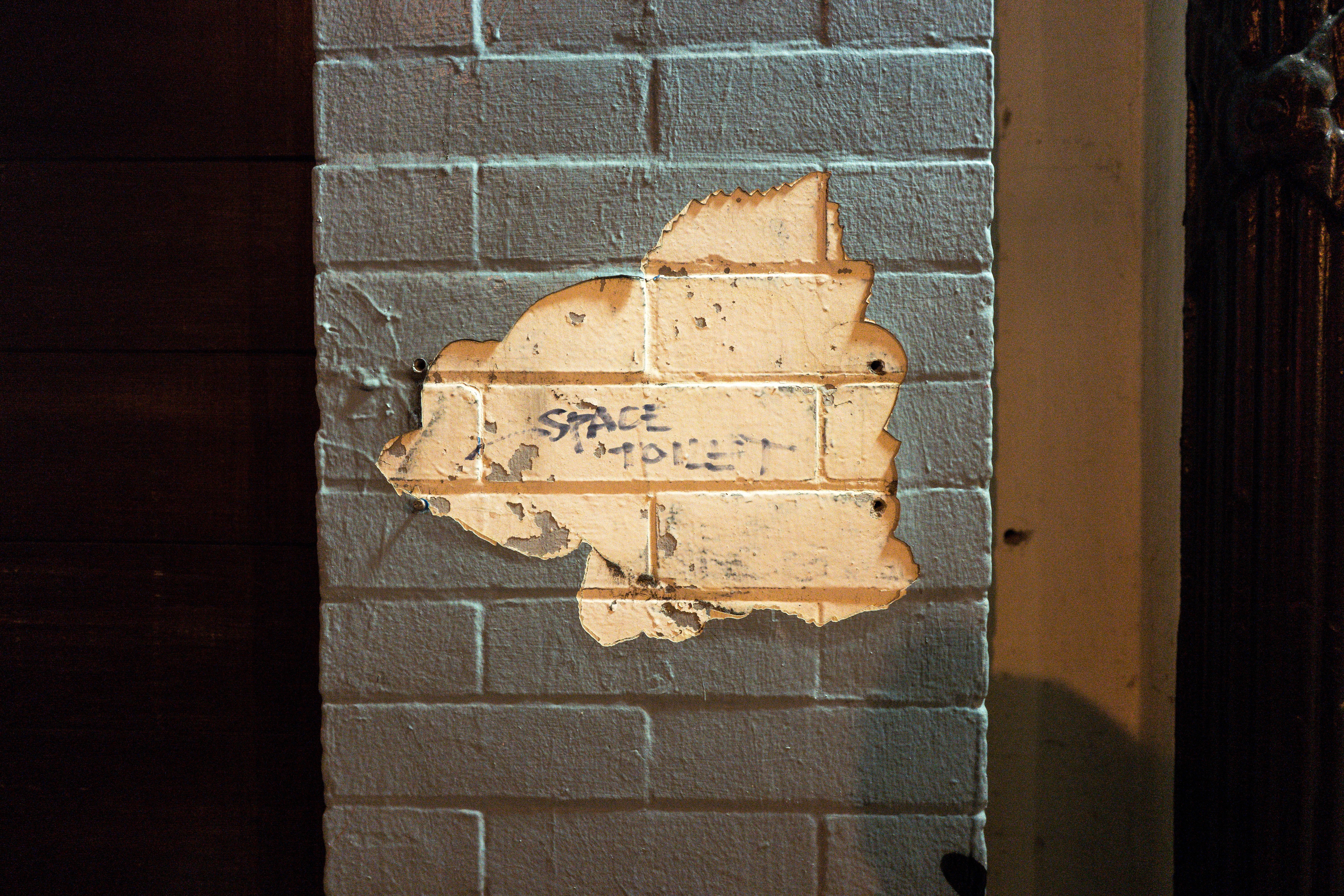 The photograph captures a peeling section of plaster revealing the words 'SPACE TOILET', hinting at a forgotten past. Dim lighting enhances the gritty, abandoned atmosphere, while the contrasting textures of the brick and chipped paint evoke a sense of urban decay. This composition invites curiosity about the story behind the faded message and the space it once indicated.